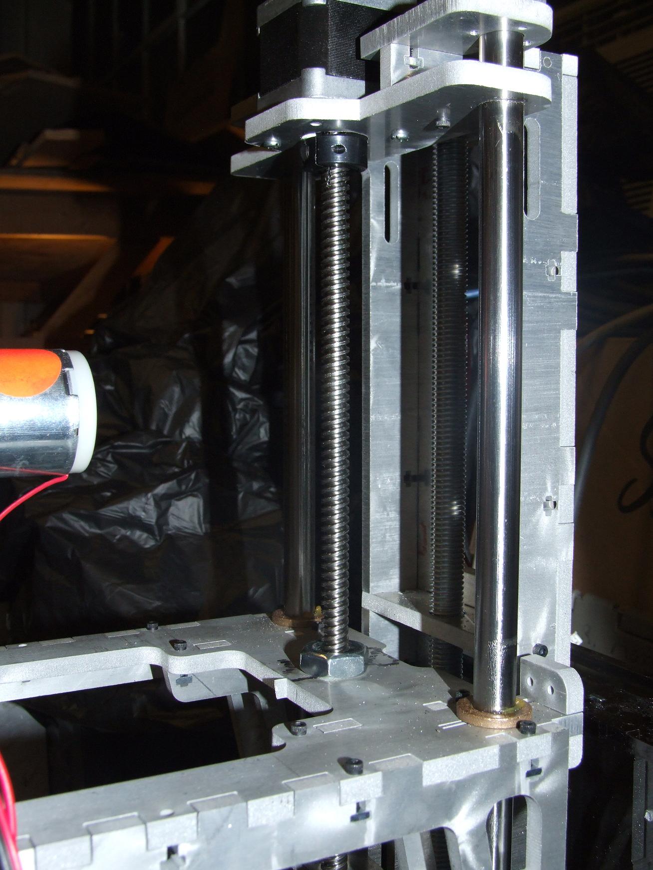 Here is the Z axis installed. The leadscrew nut has a threaded portion, so securing it to the “diving board” was done with a simple nut. There’s no outboard support for the Z axis leadscrew – all of the Z axis weight rests on the stepper motor’s bearings.