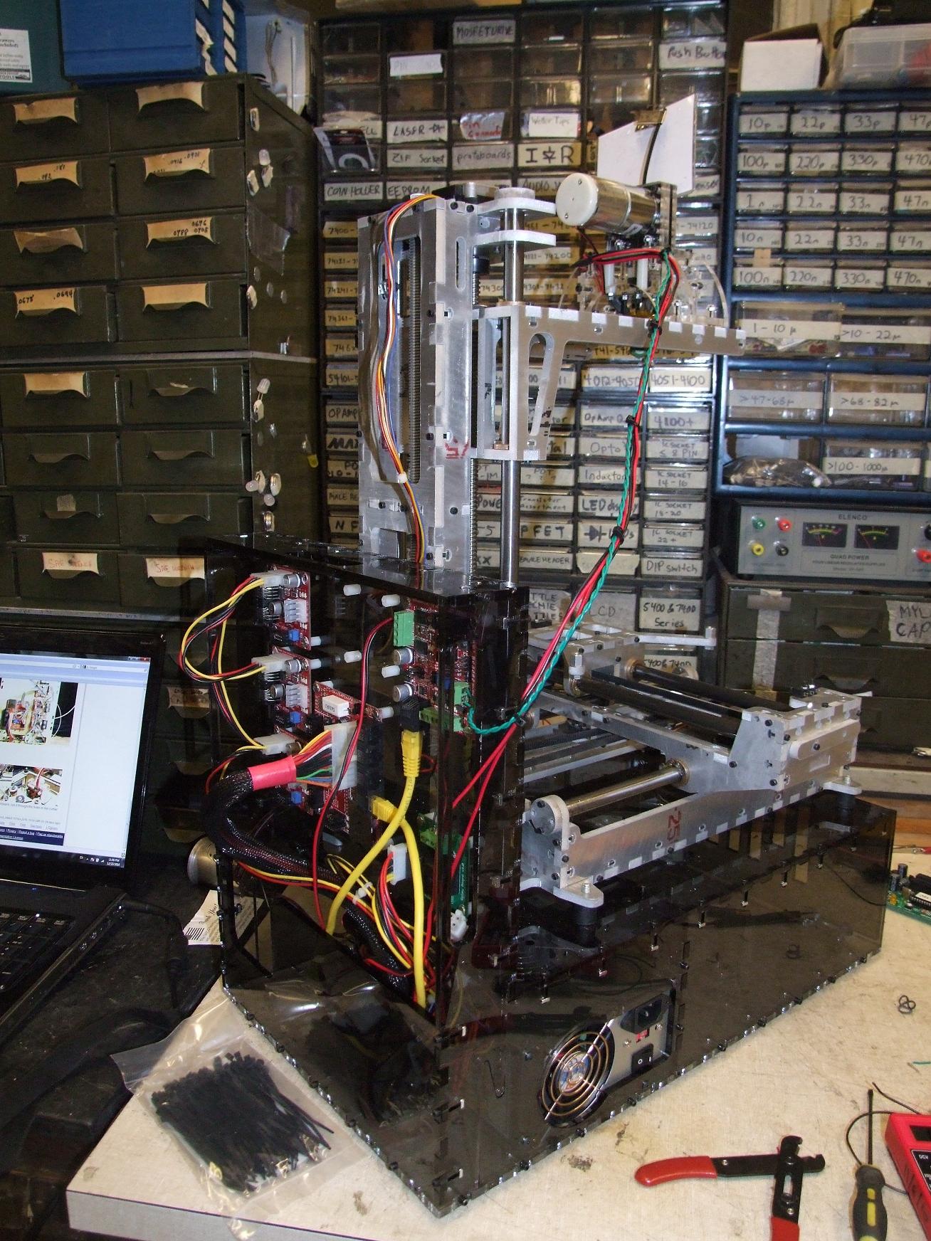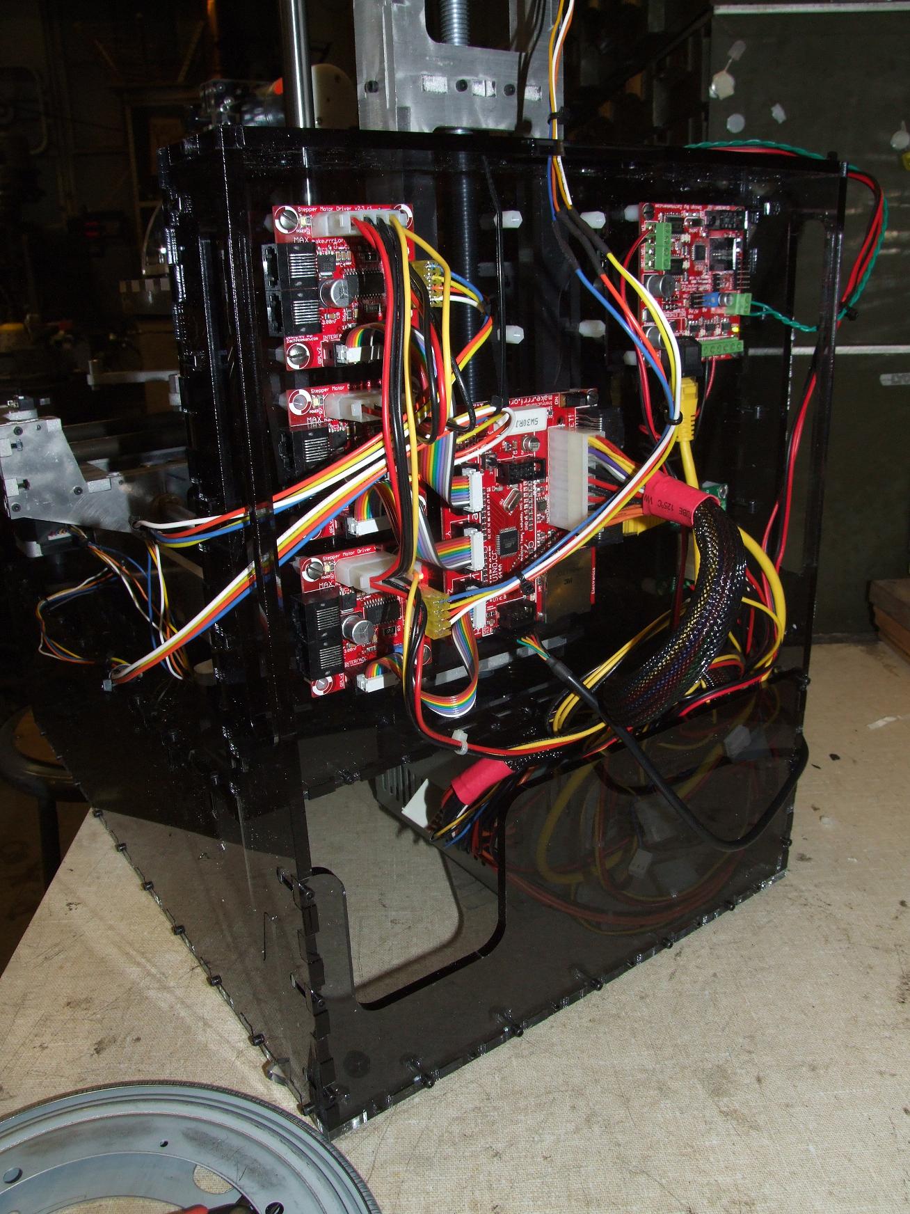 I had all the limit switches mounted, but decided to save wiring them up for later. In the mean time, I began plugging everything in and creating wiring harnesses. Wiring the bot was straightfoward, save for some guesswork as to which wires on my non-stock stepper motors went to the … umm… helpfully labeled “A B C D” connections. Come on, is “A+ A- B+ B-“‘ too descriptive?!