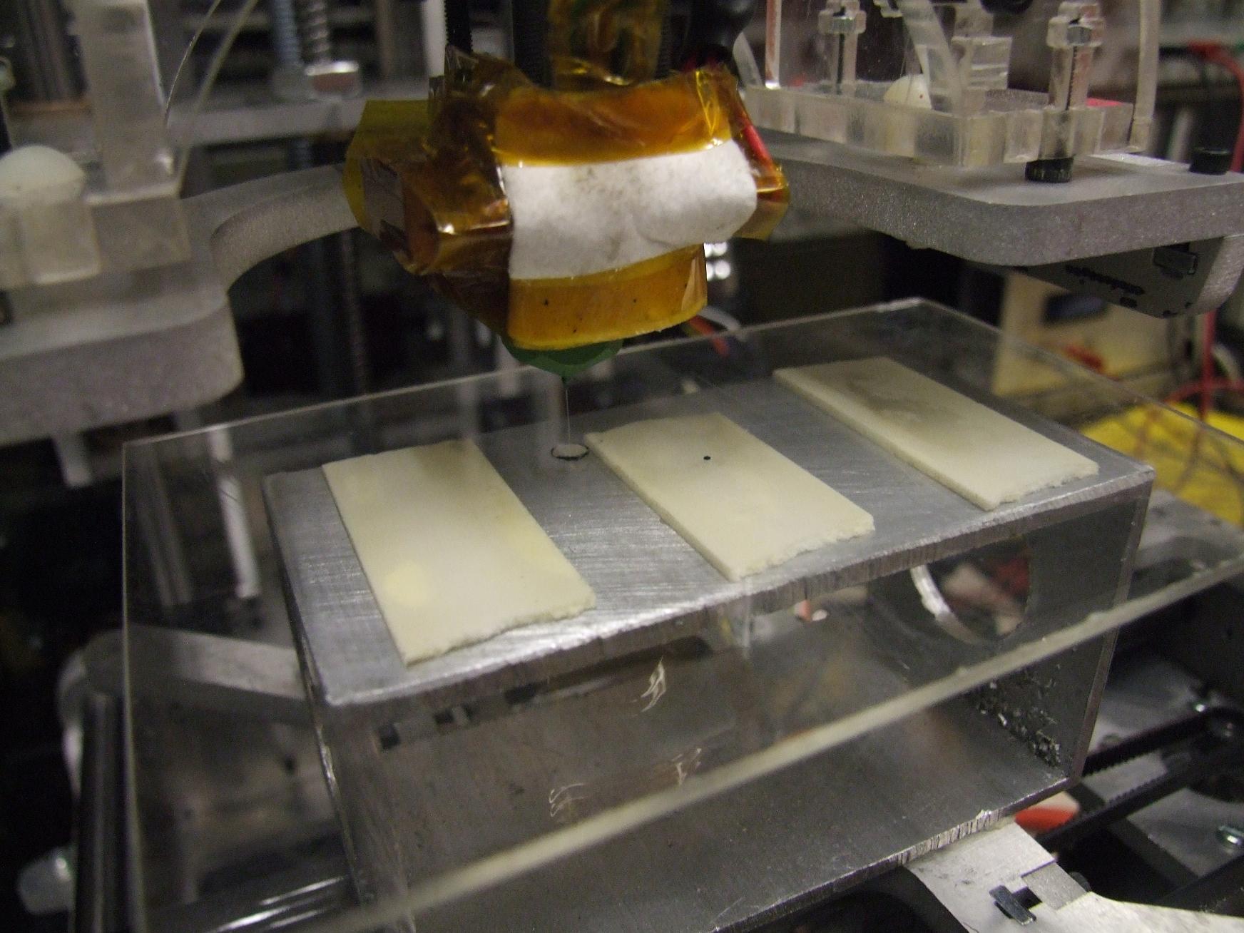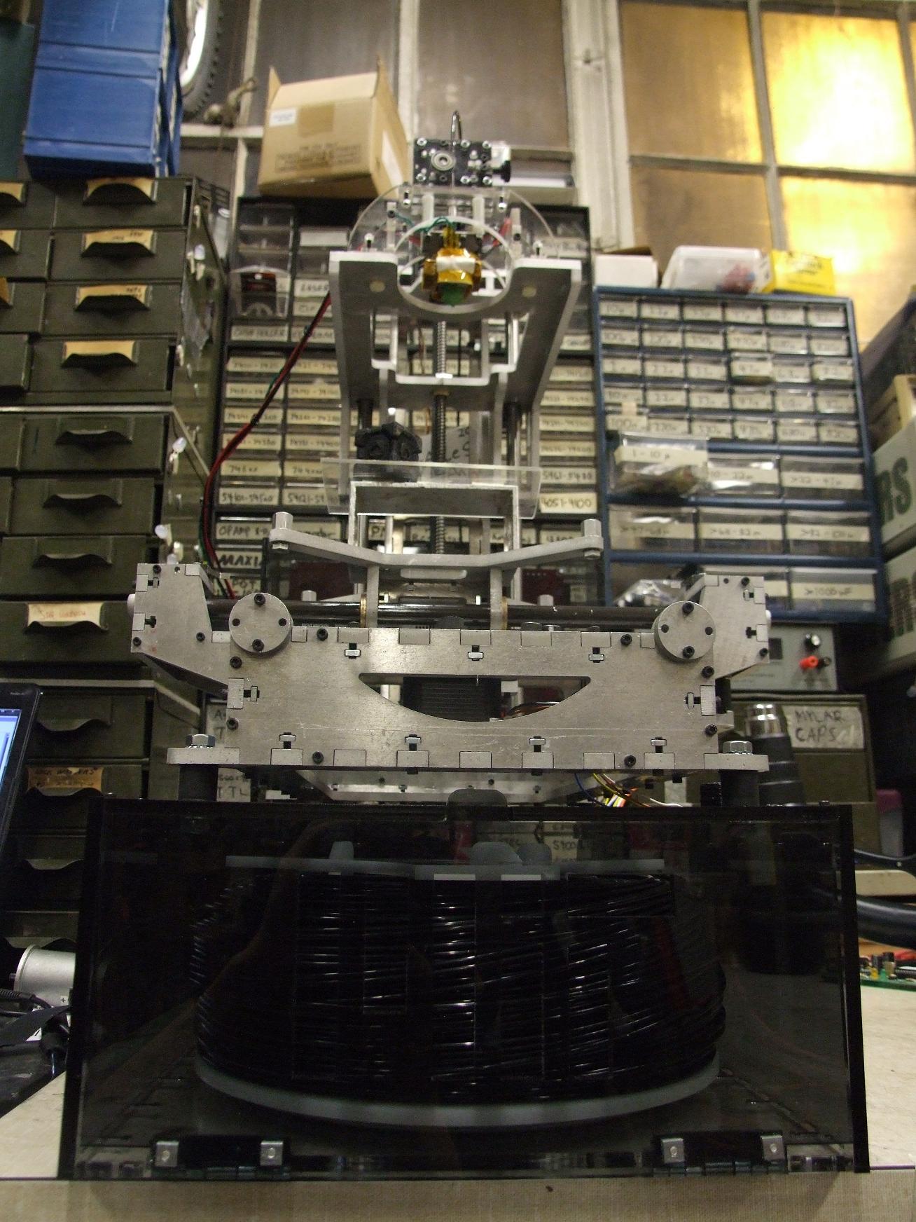 After a few days of Just Beasting It, I’m proud to announce that the Make-A-Bot is now making stuff. It’s kind of a change for me to build something useful for once, and it’s also very amusing to watch… I’m not sure why. I’m literally watching plastic melt and set again, but I’m finding myself entranced by the cyclic movements of the build surface. And then a thing just kind of appears at the end.