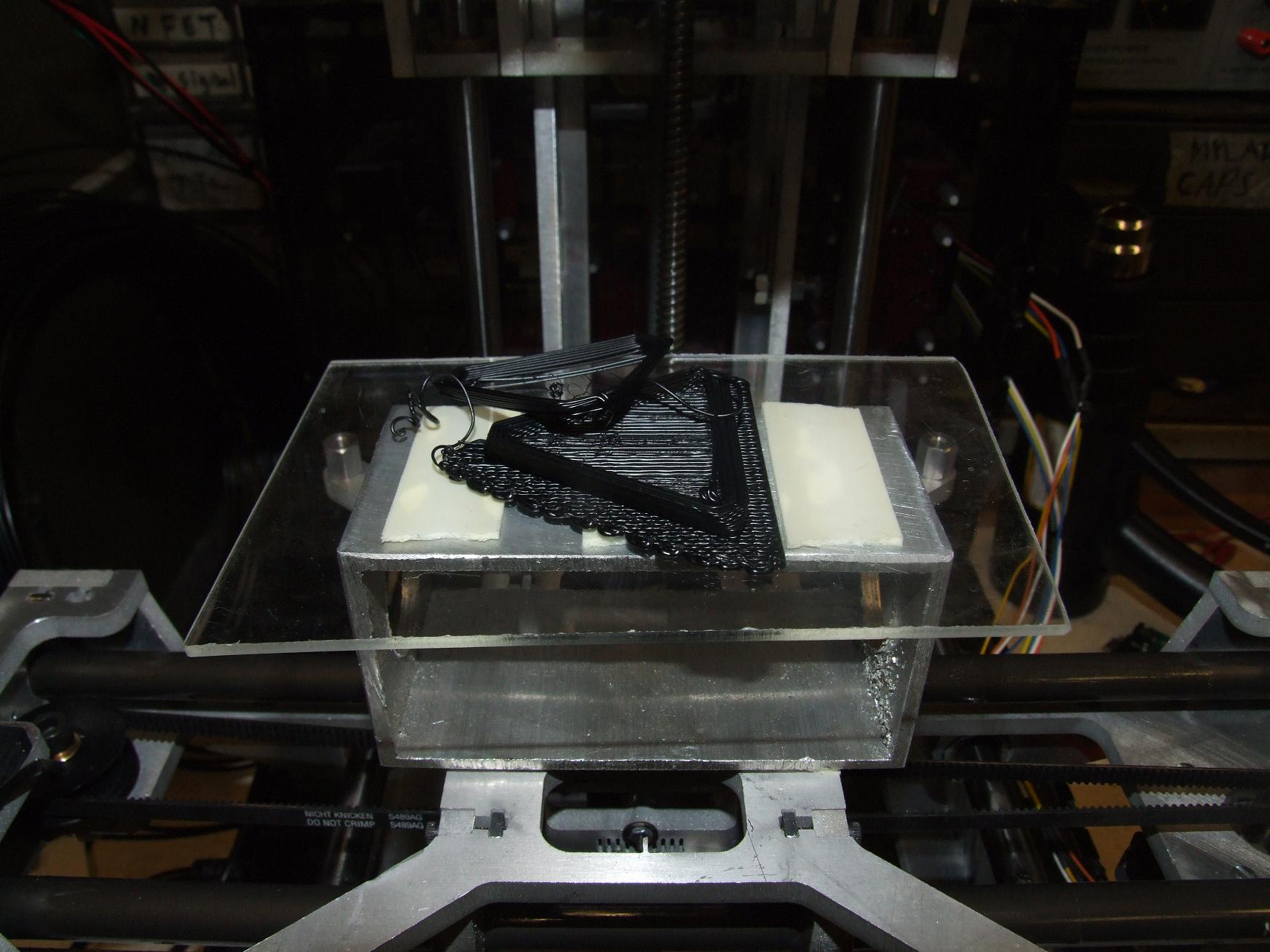 I pitched together a build surface reeeeally quickly out of some scrap acrylic sheet and a piece of aluminum box channel, all double-sided taped together and slammed right onto the carriage. Immediately after that, I proceeded to plant the at-temperature Z axis right into the surface of the acrylic… which prompt melted and left a huge divot.