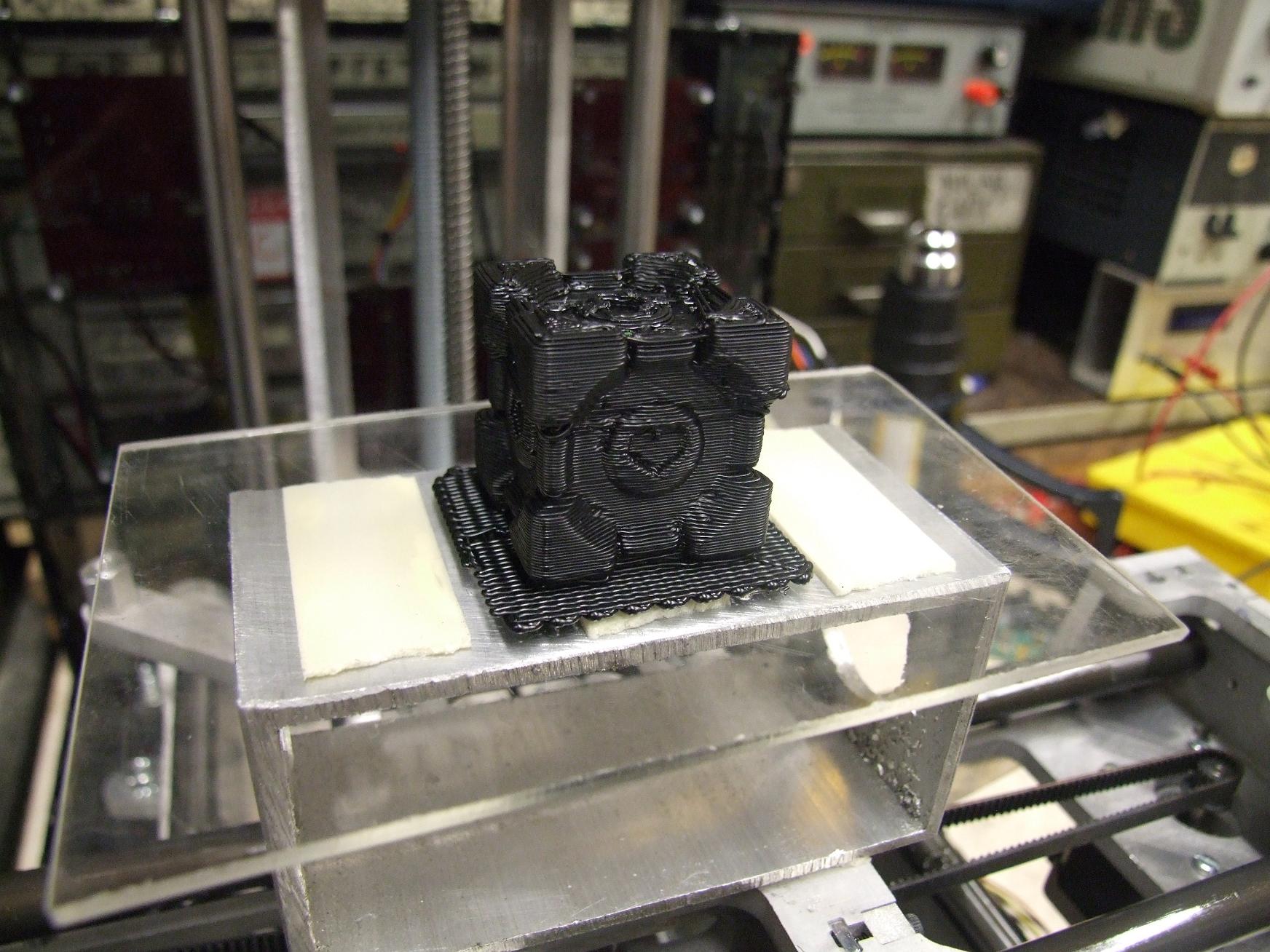 I elected to make a companion cube next because it was more interesting than a calibration cube. Overall impression: not bad. A bit goopy on some edges, and there was tons of “undamped drooling” on overhangs and layers with multiple closed cross sections like the top surface. The extruder drools alot. I believe this is a problem that is in the process of being tamed by the community through the use of stepper motor head drives and timed shutdowns and startups.