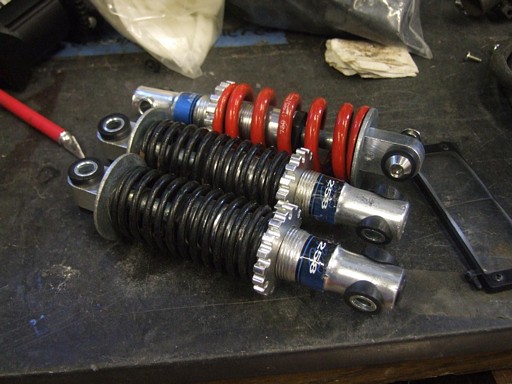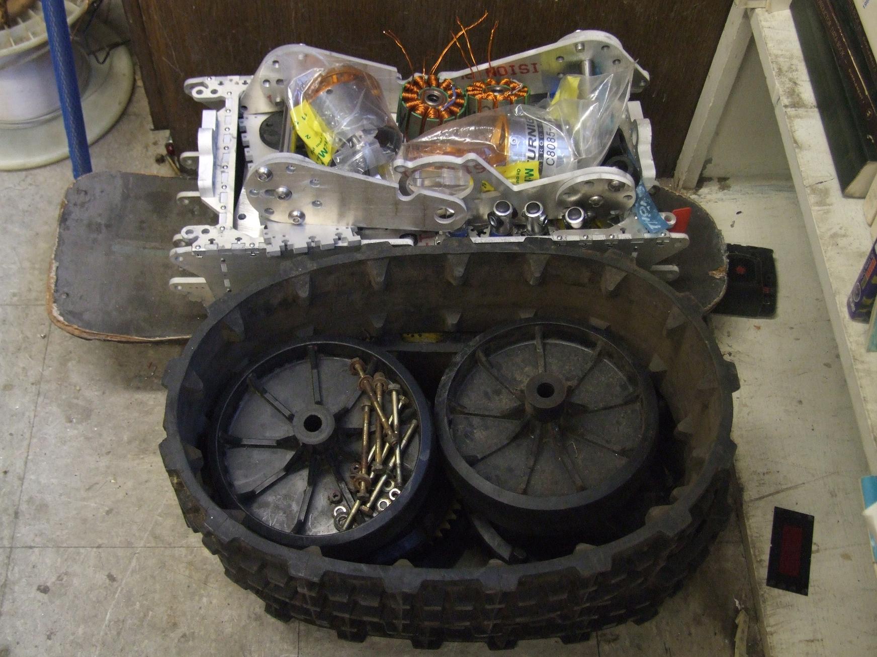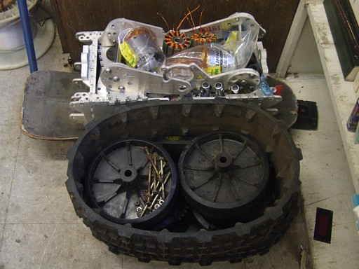 A while back, I scrounged some interesting looking springs from a pile of crufted hardware. Turns out they were a great fit over the cheap mountain bike shocks I picked up for the bogie suspension. I actually think they might be too soft – since I can actually manage to compress them slightly with my hand – but I think they’re better than the 750 pound per inch “springs” that came with the stock units. For 750lb/in, I might as well just bolt the tracks to the body with rubber blocks. All four shocks were “re-sprung”.
