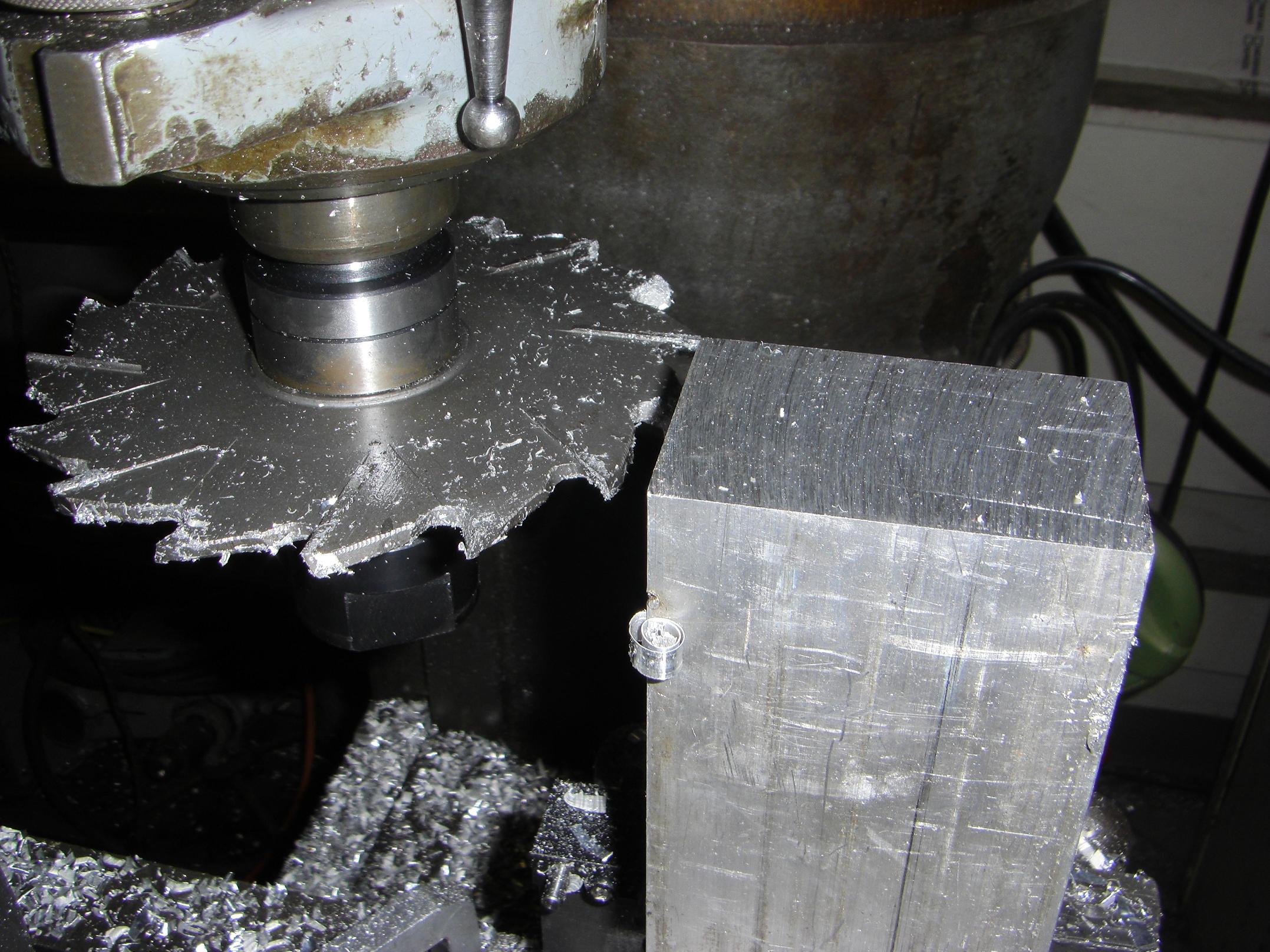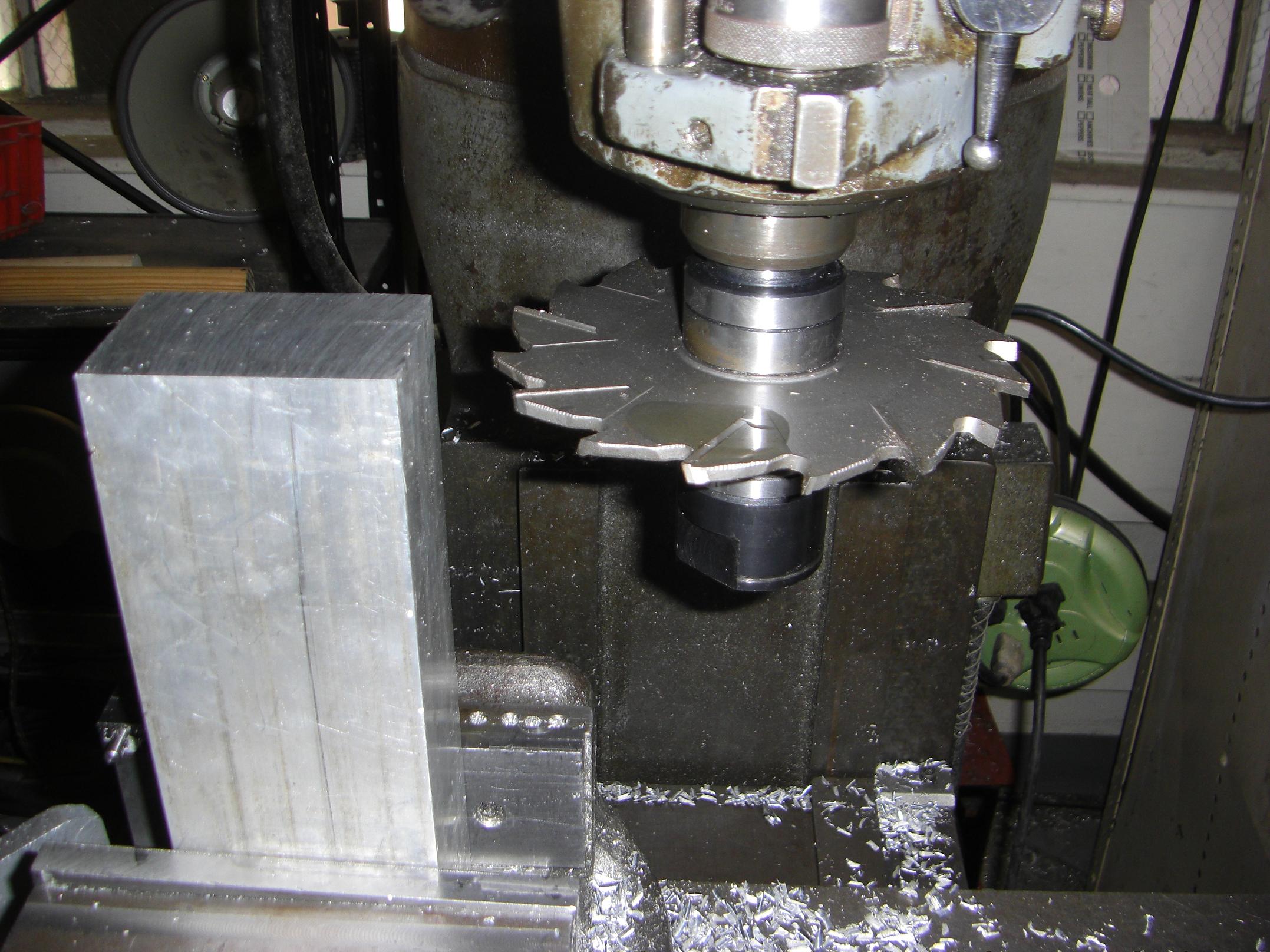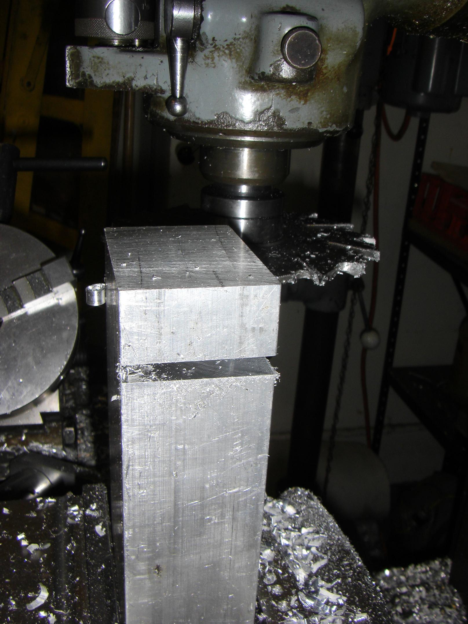 So, with the machine in low gear, a constant stream of Tap Magic, and everything cranked down as tight as I could manage, I plowed the cutter through just under 2 inches of aluminum leaving a roughly .02″ thick edge uncut. This was done mostly to keep the block from being pitched through a window as soon as it fell off the saw. The whole process took a minute, and…