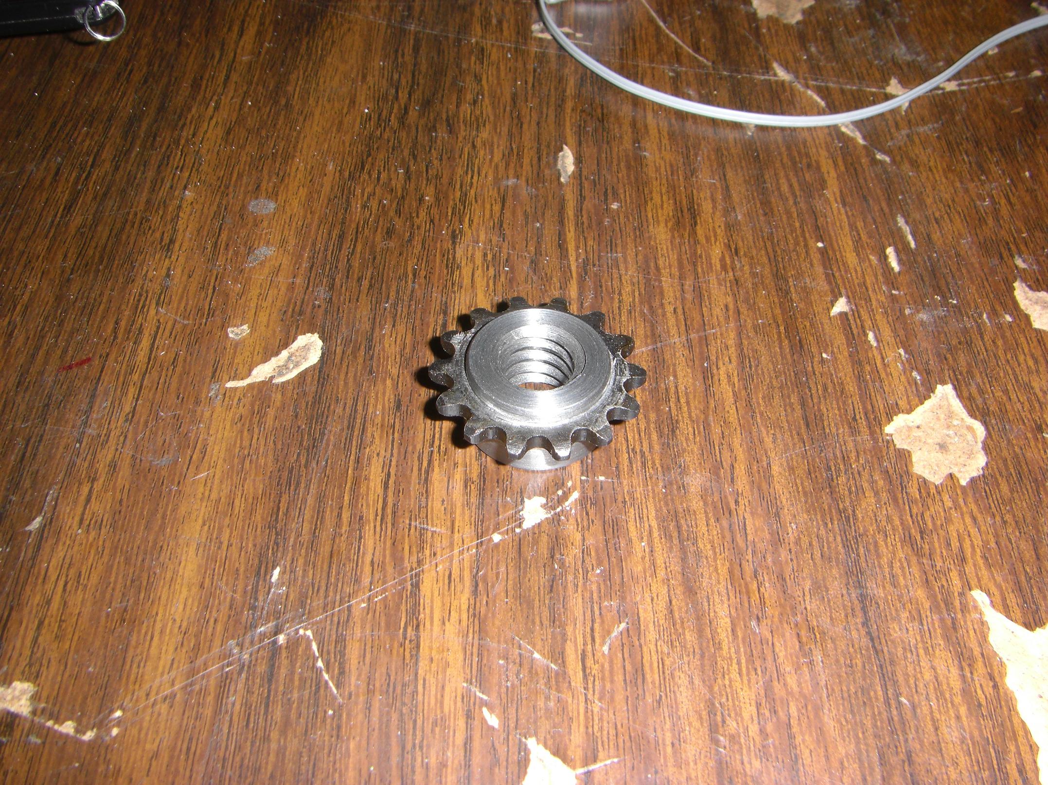 The 14 tooth sprocket shown here is squeeze-fitted onto a 1/2″-10 Acme nut, which, incidentally, is also Surplus Center hardware.There will be an 11 tooth sprocket mounted on the drill motor output shaft.