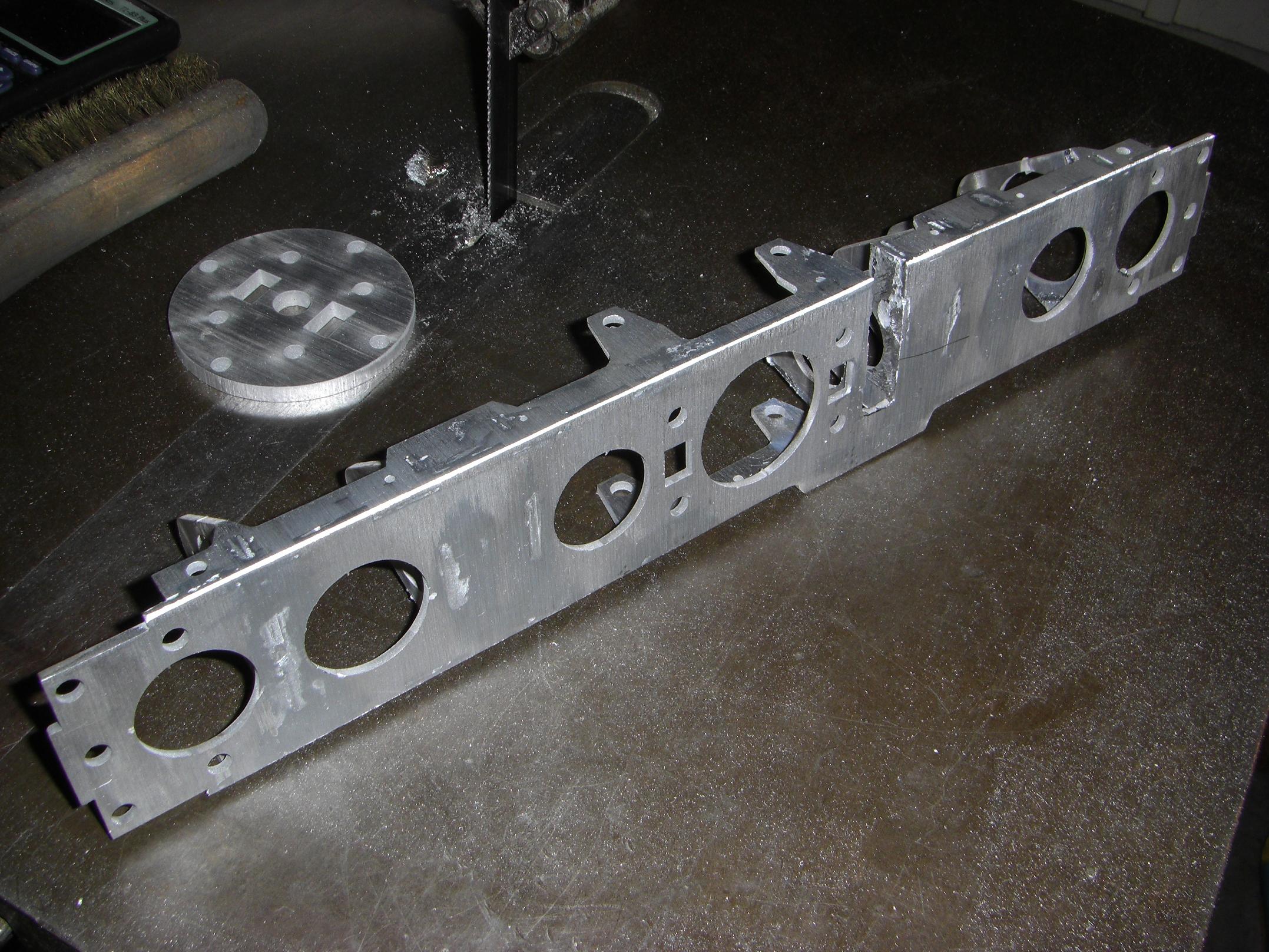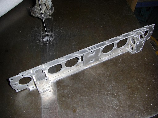 Back frame rail temporarily slipped together. Drive motors mount to the two projections, and the clamp actuator is (mostly) integral to the frame itself.