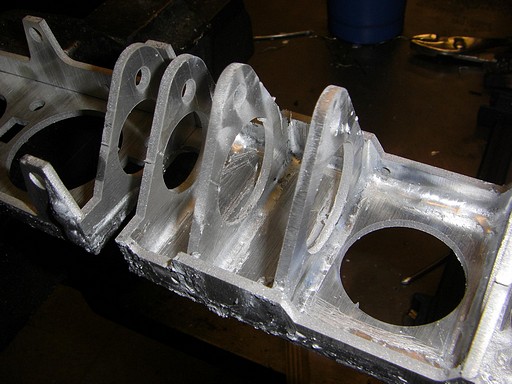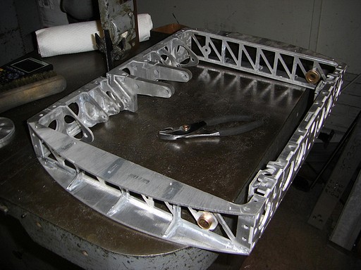 Here’s the front frame assembly in the “glob on as much brazing alloy as you possibly can” stage of fabrication. I heat up all the requisite areas of the metal and liberally distribute and wet the surface of the aluminum at the tabs with the zinc-aluminum braze.