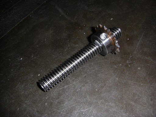 I bored, drilled and tapped one of the Surplus Center sprockets to fit the 1/2″ ACME leadscrew. The screw itself has two flats to let the set screws grip properly, and an end-threaded hole to act as a physical stop for the clamp.
