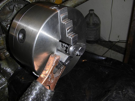 Then I welded the ring to the sprocket on the exposed end. While all this was fixtured on the lathe chuck, of course. The sensitive machine surfaces were covered with a welding blanket first.