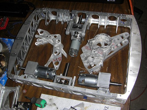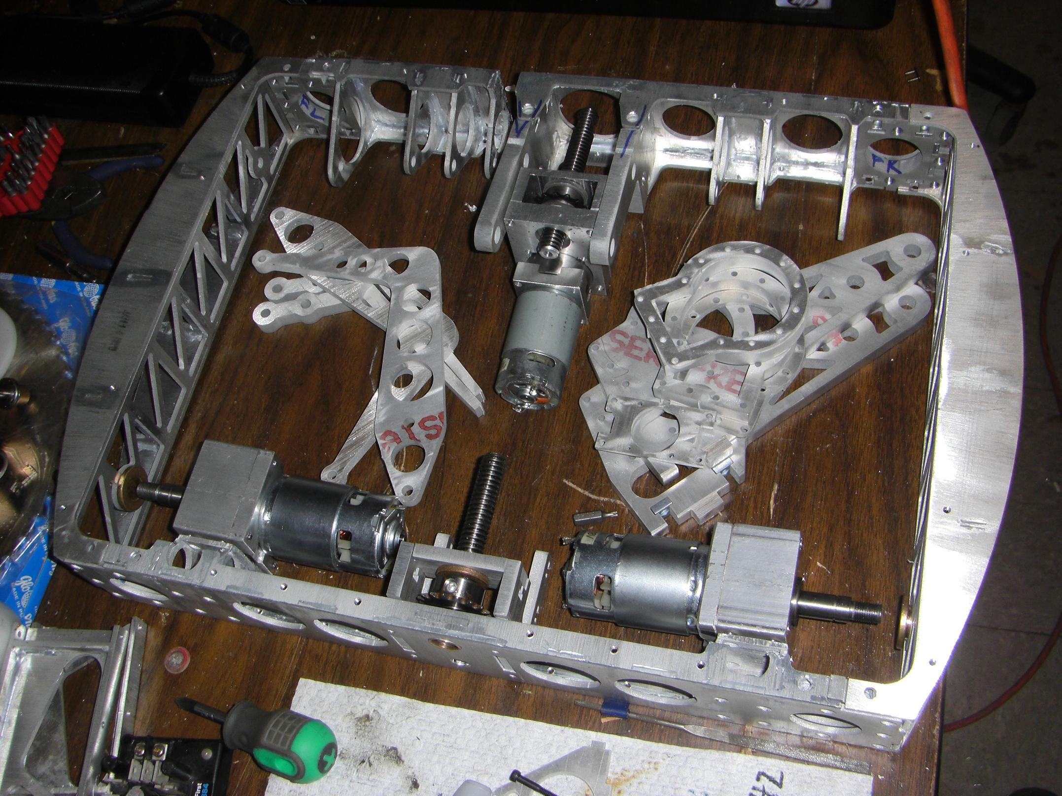 Mocking up the rear actuator. The bottom plate hole pattern mounts a Banebots 20:1 28mm gearmotor.