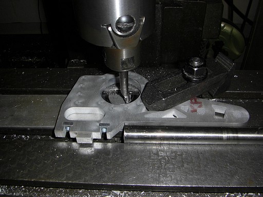 Normally this would be a simple boring operation to resize the hole, but it was greatly complicated by the fact that my brilliant design skills left no two continuous parallel edges to fixture to in a vise.